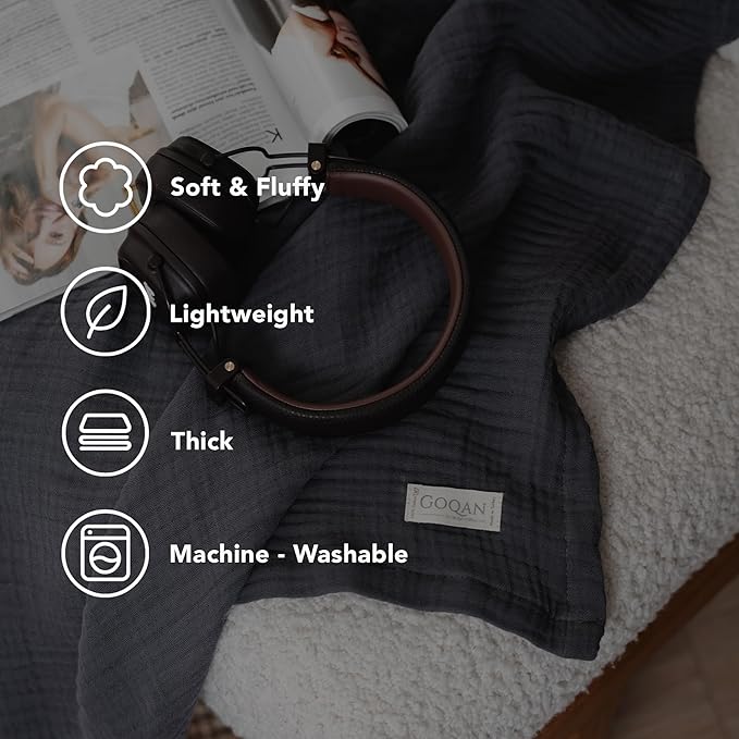 Goqan Muslin Blanket Queen 79x90 – 100% Turkish Cotton 4 Layer Boho Muslin Blanket for Adults, Four Season, Lightweight and Thin, Soft, Breathable for Bed - Dark Grey