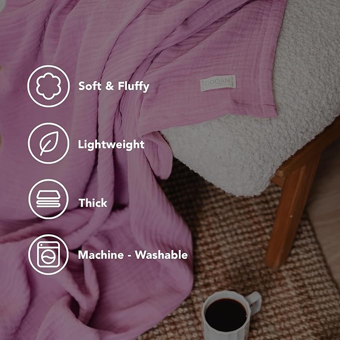 Goqan Throw Blanket 55x60 – 100% Turkish Cotton 4 Layer Boho Muslin Blanket for Adults, Four Season Blanket Lightweight and Thin, Soft, Breathable for Bed, Couch, Picnic - Pink
