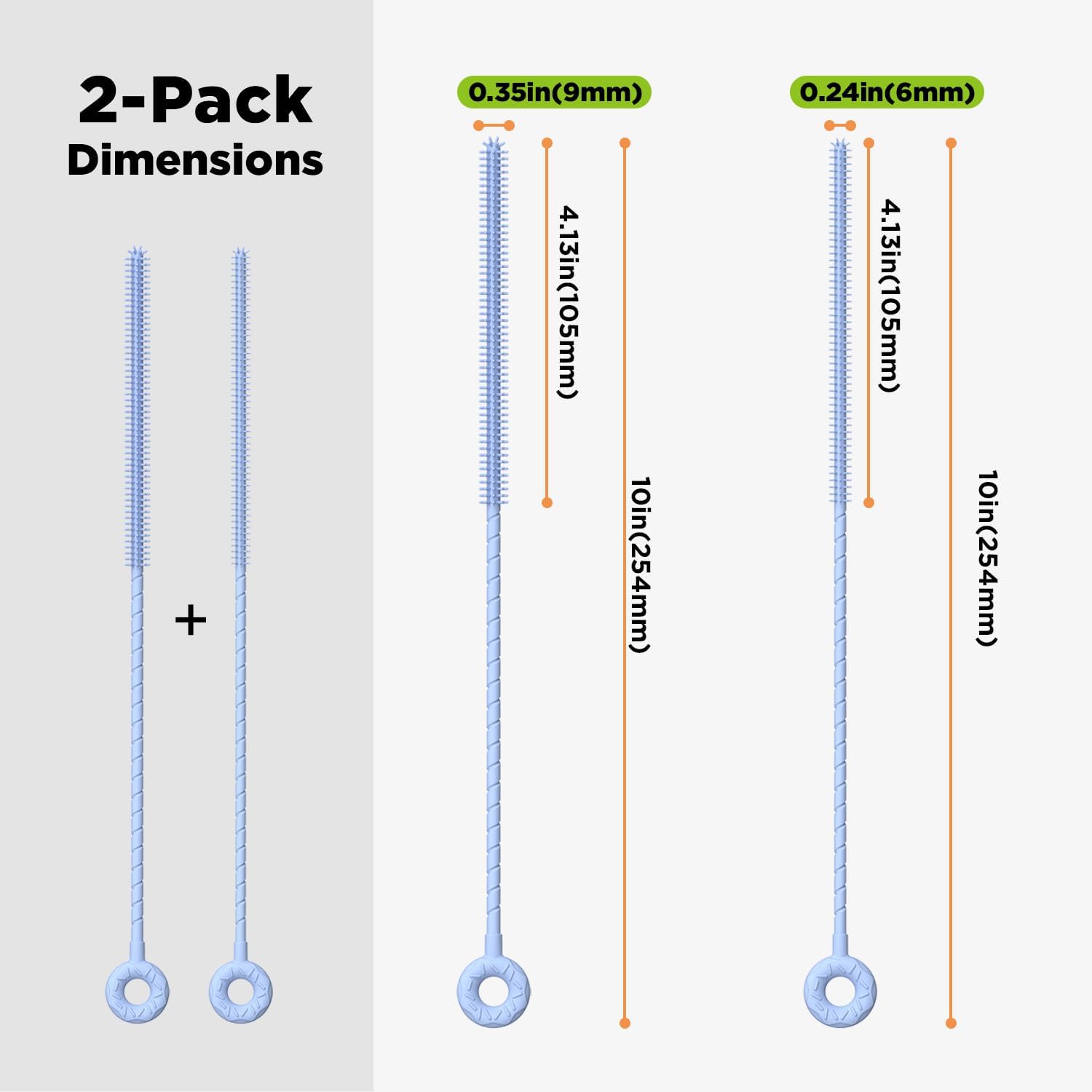 - Double Size & Extended Bristles: Two brush diameters (6mm & 9mm) with a total length of 10in. The silicone bristles extend up to 4.13in, reaching deep inside straws for a thorough clean.