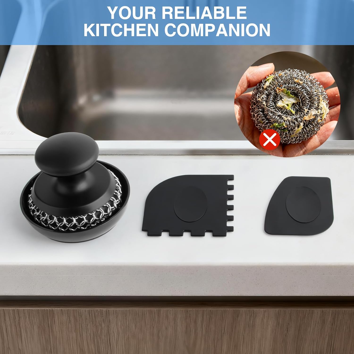 - Your Reliable Kitchen Companion: The cast iron chain mail scrubber can help you to reduce the pain of cleaning cast iron cookware. Just pick up the ergonomic and comfortable handle, scrub your cast iron pan, and throw them into the dishwasher. Keep your hands are safely away from the greasy water.