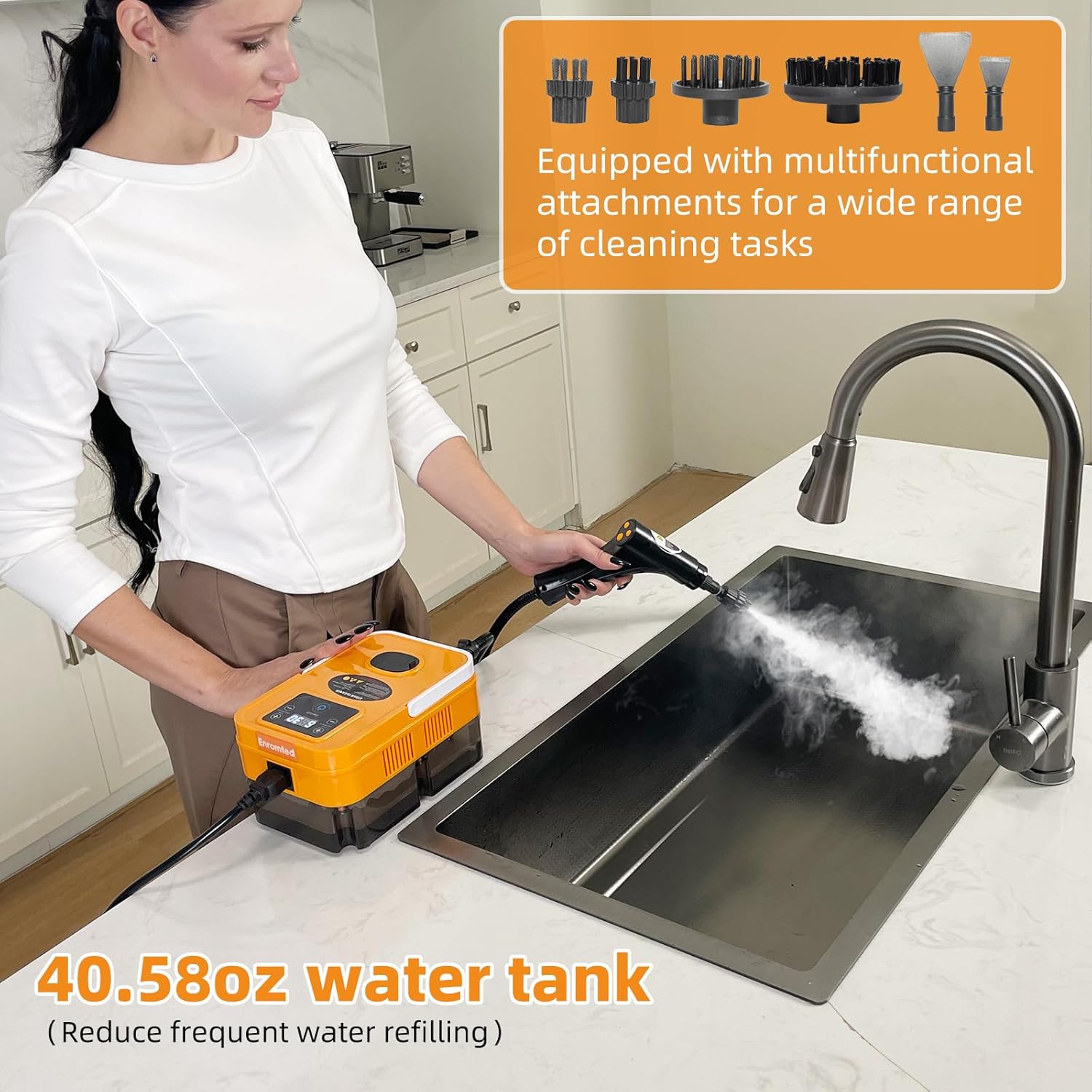 - Home steam cleaner: Steamer for cleaning with a handle-mounted 6-level adjustable steam control, steam cleaners 1500W power operation, delivering 3BAR pressure and 221°F temperature. Heats up in just 15 seconds, and features a 40.58oz water tank (providing up to 30 minutes of continuous runtime), extending use time and reducing the need for frequent refills.It is very suitable for use as a household portable steam cleaner or a grout steamer for tile floors for various surfaces.