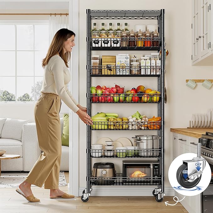 7 Tier Wire Shelving with Wheels 72" H Adjustable Basket Shelf Storage Shelves with Hooks for Kitchen Bathroom Pantry Shelves Closet Laundry Room Organization 72" H x 30" W x 14" D, Black