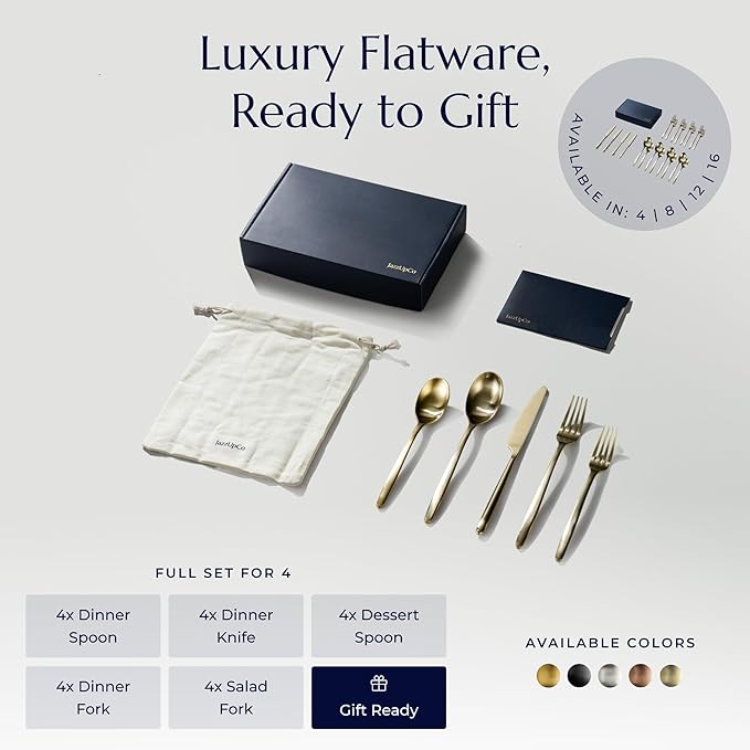 JazzUpCo Ava Flatware Flatware non toxic 18/10 stainless steel dishwasher safe (Matte Champagne Gold, 12 Person Set (60 Pieces))