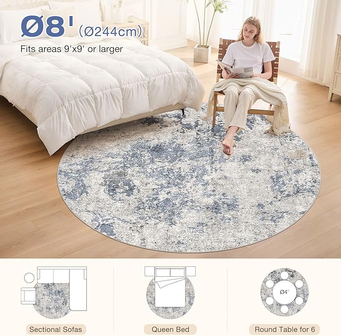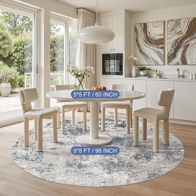 8ft Round Area Rugs for Living Room: 8x8 Abstract Washable Rug Modern Large Soft Stain Resistant Non-Slip Backing Machine Table for Bedroom Dining Room Indoor Home Office Carpet - Blue Brown