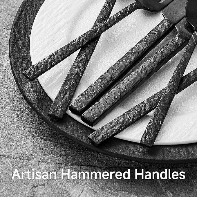 KINGSTONE 36 Pcs Black Hammered Silverware Set with Steak Knives for 6, 18/10 Stainless Steel Heavy Duty Flatware Set, Tableware Cutlery Utensil Sets for Home Restaurant Dishwasher Safe