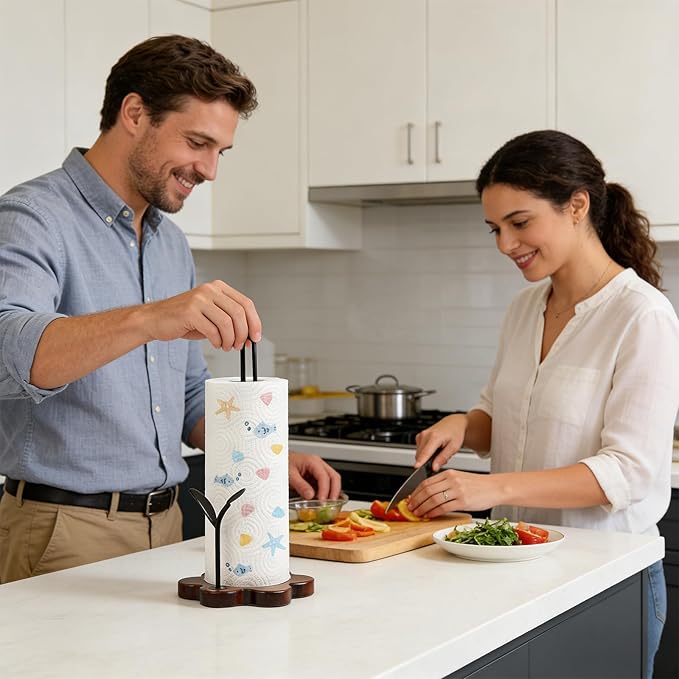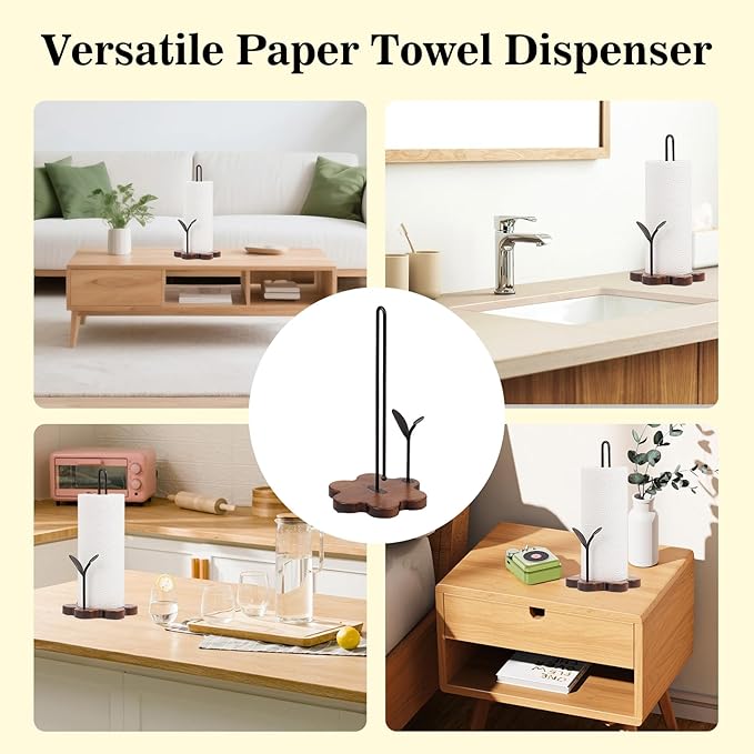 - 【Elegant Design】: This elegant kitchen paper towel holder features a pure natural solid wood base, handmade, each product is unique! It comes with a charming floral base and high-quality double iron bars, adding elegance to your home while enhancing the beauty of kitchen decoration