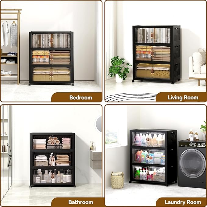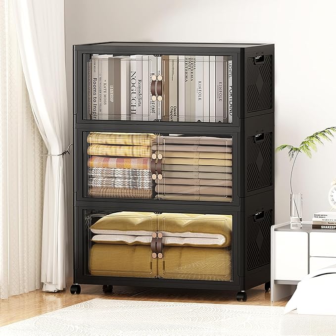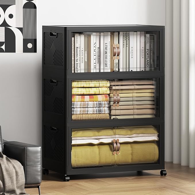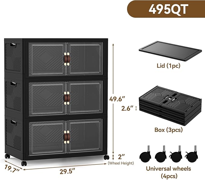 SAILUN 495QT Stackable Storage Bins with Lid, Collapsible Storage Bins With Doors and Wheels, Folding Plastic Cabinet Containers for Home Kitchen Closet Organization, 3 Pack