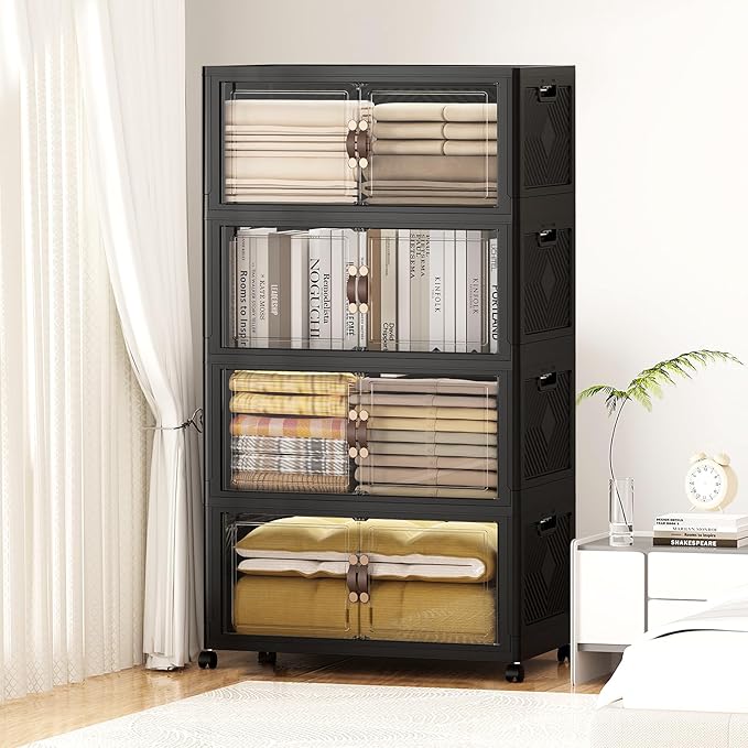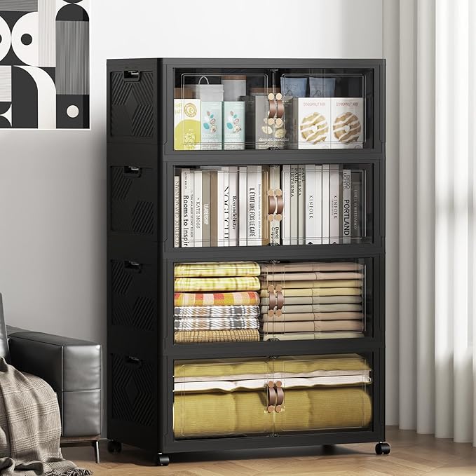 SAILUN 660QT Stackable Storage Bins with Lid, Collapsible Storage Bins With Doors and Wheels, Folding Plastic Cabinet Containers for Home Kitchen Closet Organization, 4 Pack