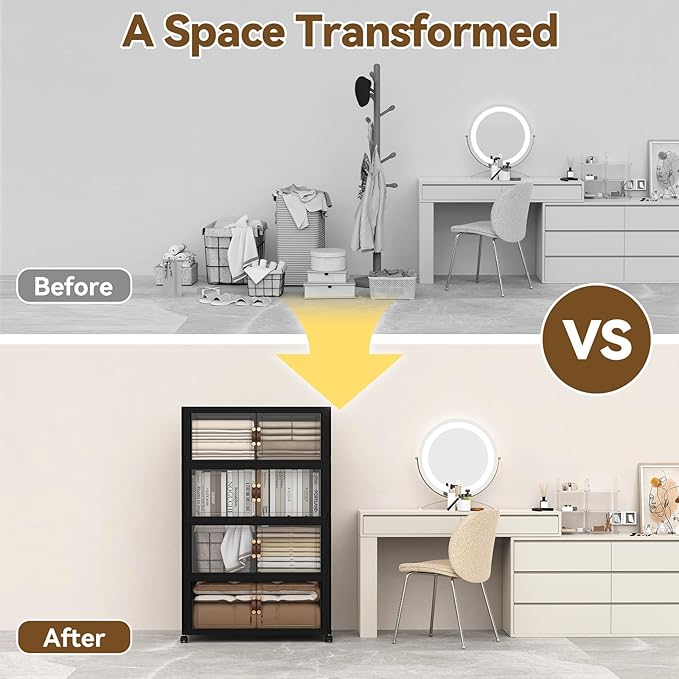 - 【Dual Access Design】You can choose between a front door with a magnetic latch handle (for regular small items) or an overhead door (for accessing bulky items such as blankets, luggage or holiday decorations). The magnetic door design ensures that nothing falls out and opens smoothly. Large stackable storage bins stores more items.