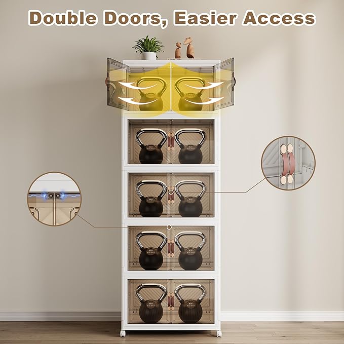 - 【Dual Access Design】You can choose between a front door with a magnetic latch handle (for regular small items) or an overhead door (for accessing bulky items such as blankets, luggage or holiday decorations). The magnetic door design ensures that nothing falls out and opens smoothly. Large stackable storage bins stores more items.