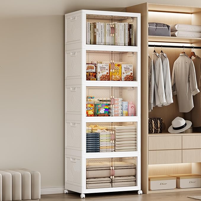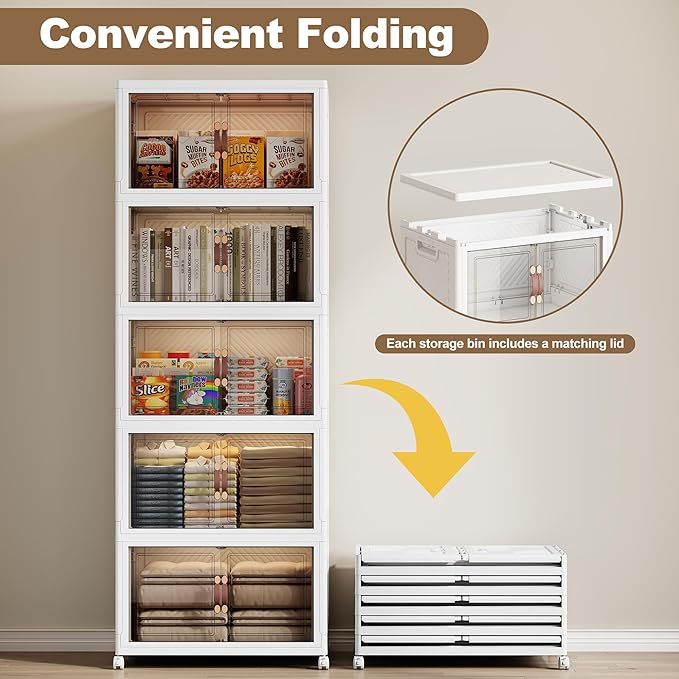 SAILUN 275QT/69Gal Stackable Storage Bins with Lid, Collapsible Storage Bins With Doors and Wheels, Folding Plastic Cabinet Containers for Home Kitchen Closet Organization, 5 Pack