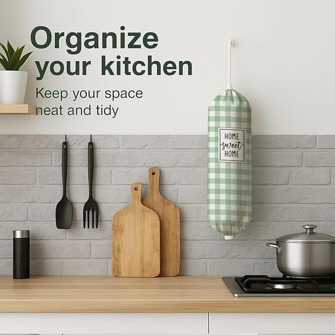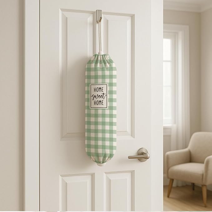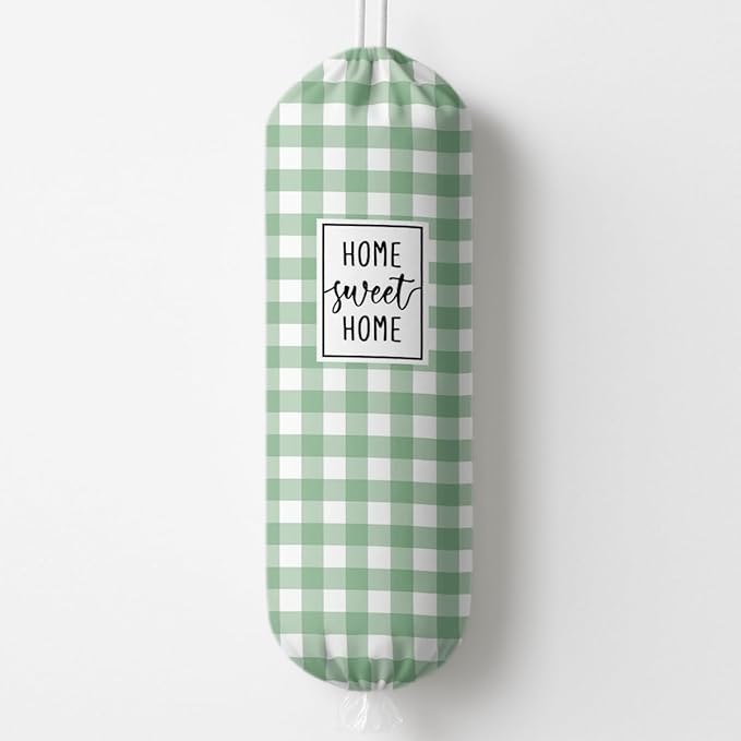 Plastic Bag Holder, Home Sweet Home Plastic Bag Holder for Kitchen Essentials, Green and White Grid Bags Holders for Plastics Bags Groceries Store, Reusable Hanging Trash Sack Dispenser