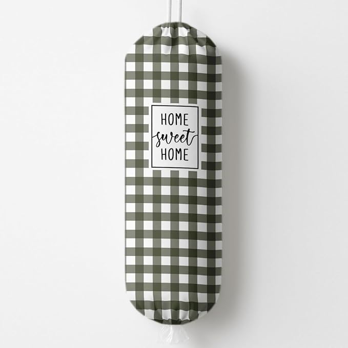 Plastic Bag Holder, Home Sweet Home Plastic Bag Holder for Kitchen Essentials, Olive Green and White Grid Bags Holders for Plastics Bags Groceries Store, Reusable Hanging Trash Sack Dispenser
