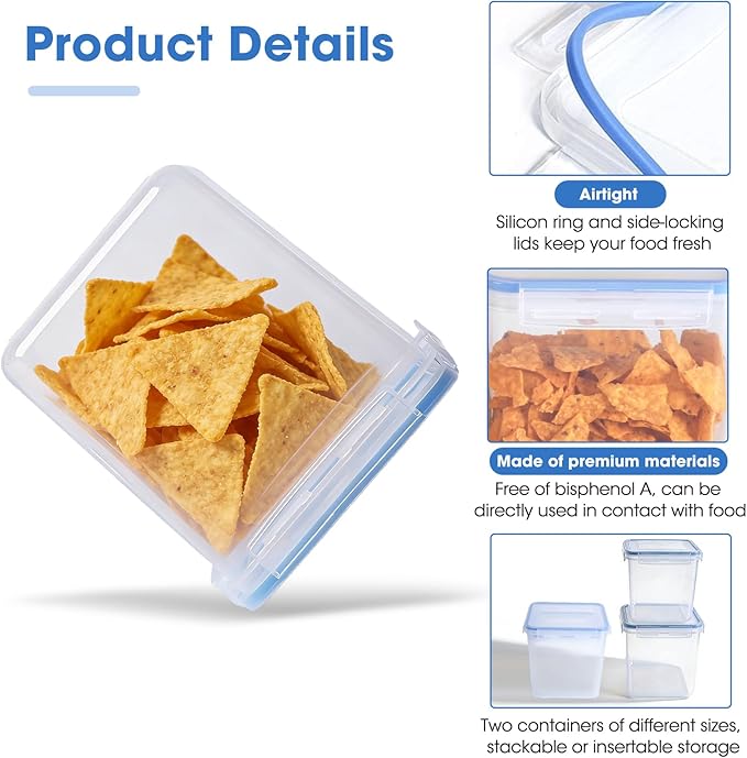 - Your Favorite Chip Storage Containers: Our chip storage containers include one large 5.2L container and one medium 2.5L pantry storage container. Containers are suitable for storing Doritos chips, corn chips, potato chips and other snack chips. Fits snack chip packs of any size. Snack chips are sold separately.