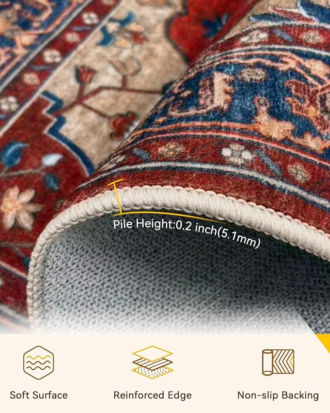 RELEANY Area Rugs 6'x9' Washable Non-Slip, Floral Vintage Distress Print Pattern Medallion Carpet for Living Room Bedroom Dining Room, Red Blue