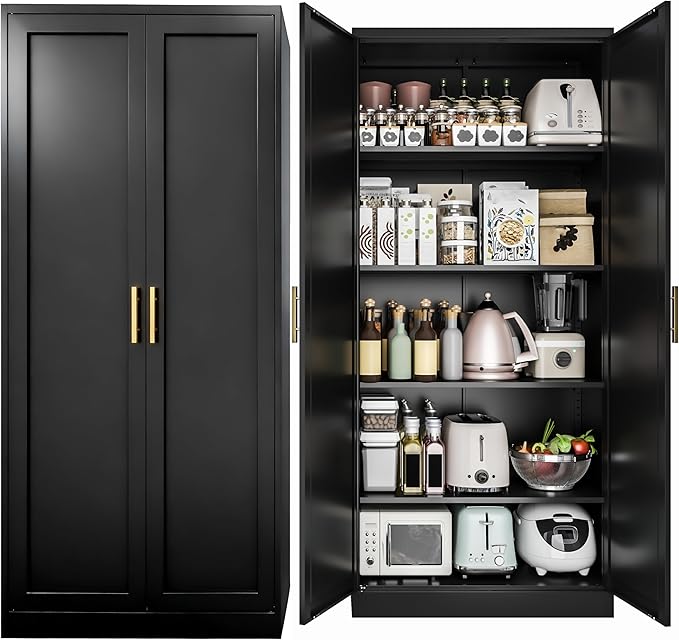 Kitchen Pantry Cabinet,71” Metal Tall Pantry Storage Cabinet with Doors and 4 Adjustable Shelves,Kitchen Storage Cabinets Black Freestanding Food Cabinet for Pantries, Kitchen, Livingroom, Dining Room